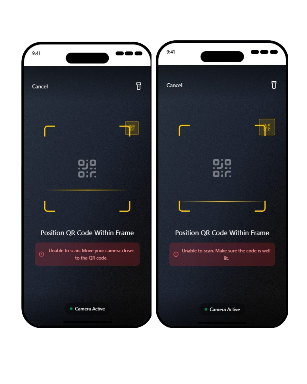 Actionable error messages with guidance like “Move closer to the QR code”