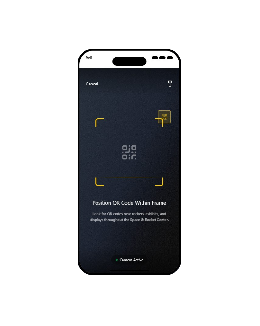 This screen shows how I added clear in-app guidance to help users scan codes without friction. The phrase “Position QR code within frame” provides simple, direct instruction, while the added line “Look for QR codes near rockets, exhibits, and displays throughout the Space & Rocket Center” connected the action to the real-world environment, helping users understand exactly what to do.