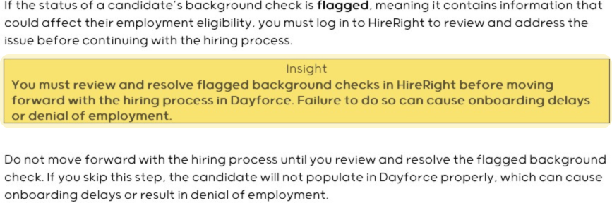I wrote lesson plans using one action per step and bolded UI elements for clarity. I aligned field names and button labels to what users saw in Dayforce and HireRight. I also added callouts to inform administrators that they must log in to HireRight to view and resolve flagged background checks before completing the hiring process in Dayforce.