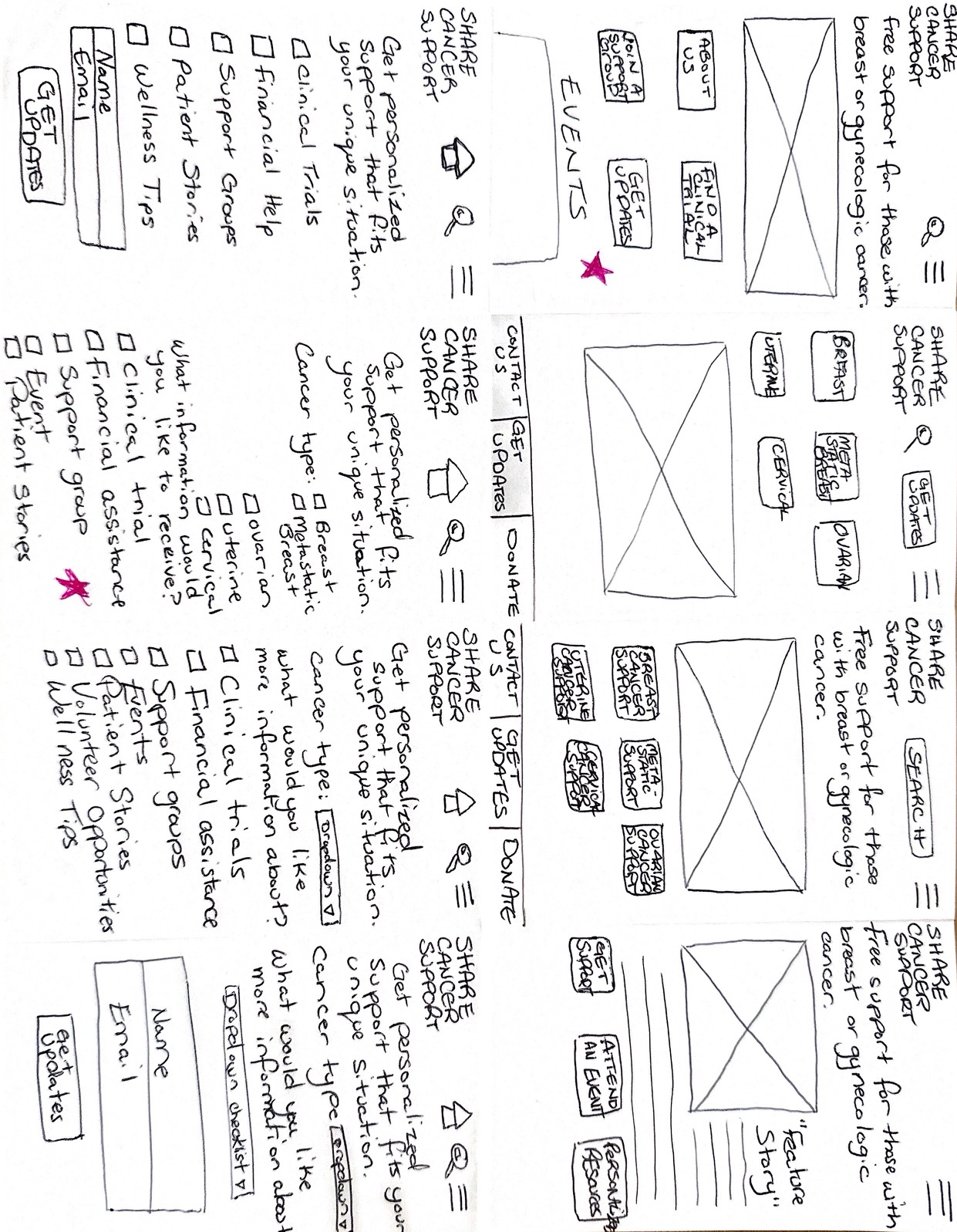 This Crazy 8s exercise helped me quickly explore layout and content hierarchy ideas for the SHARE Cancer Support homepage. I focused on making key actions such as finding clinical trials, joining support groups, and subscribing for updates more visible and intuitive. By sketching multiple variations, I was able to test different ways to simplify navigation and organize high-value content.