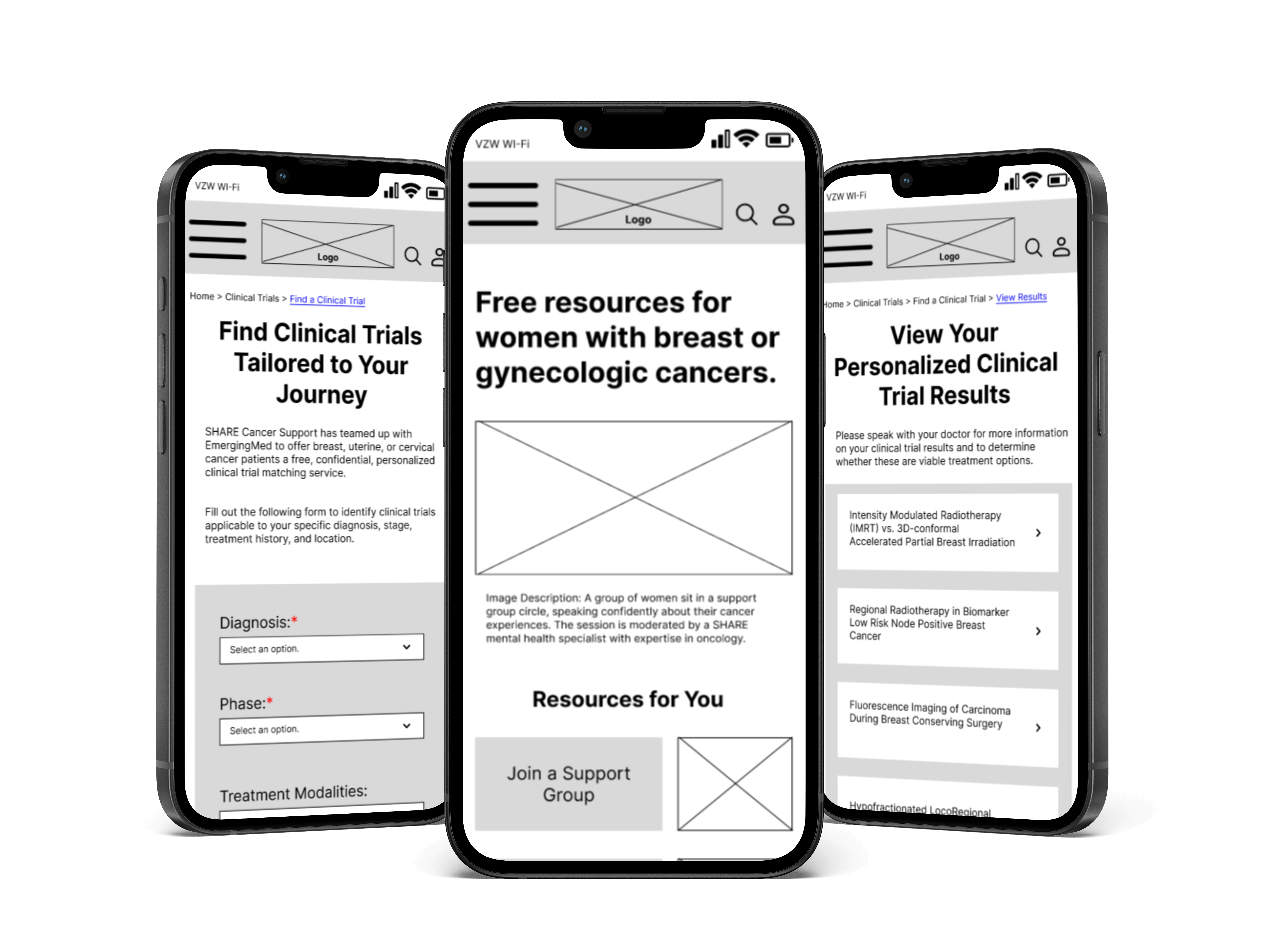 SHARE Cancer Support is a nonprofit organization that provides education, advocacy, and clinical trial resources to women affected by breast, ovarian, uterine, and cervical cancers. As part of my graduate program in User-Centered Design at Brandeis University, I worked as the Content Designer and UX Researcher on a four-person team to improve the clarity and usability of the website’s clinical trial content and navigation.