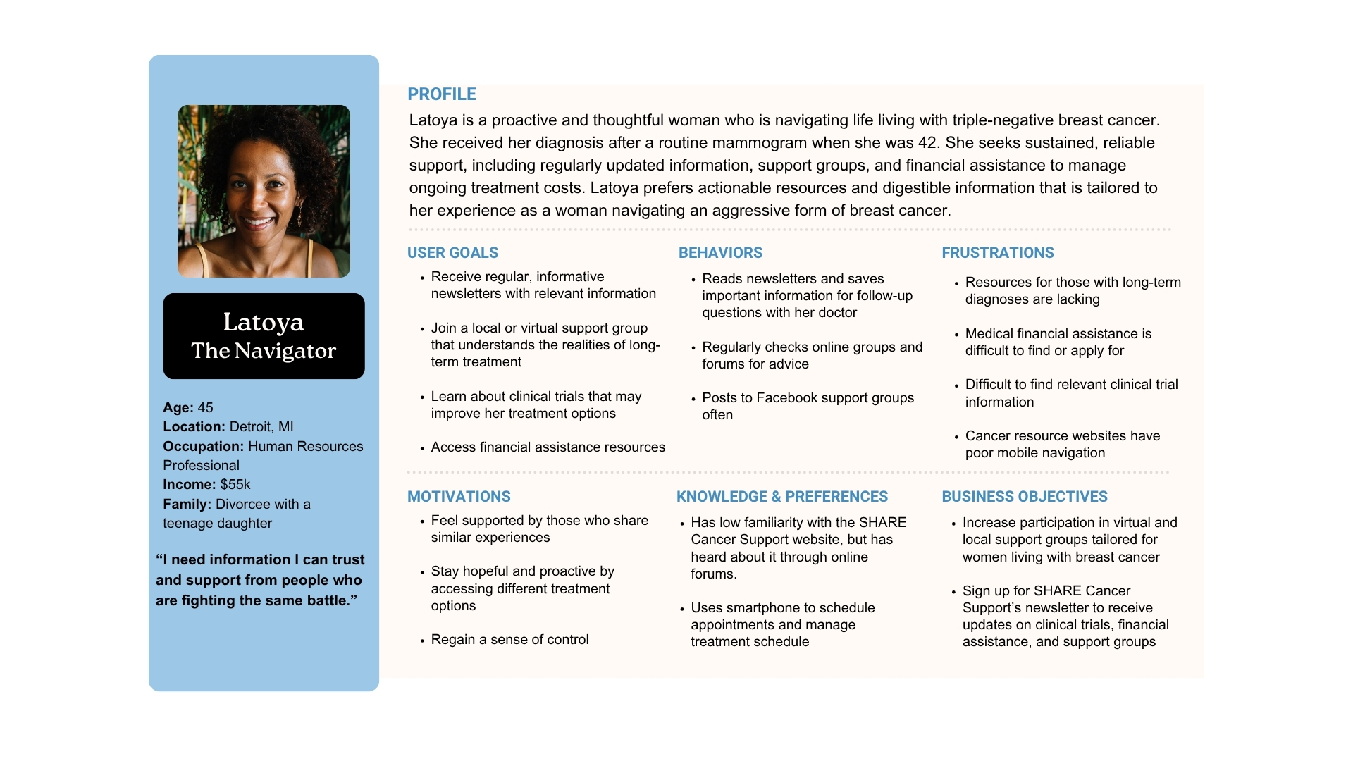 Grounding the persona in both lived experience and credible evidence helped the team empathize with users’ emotional and informational needs, and guided design decisions that prioritized clarity, trust, and accessibility.